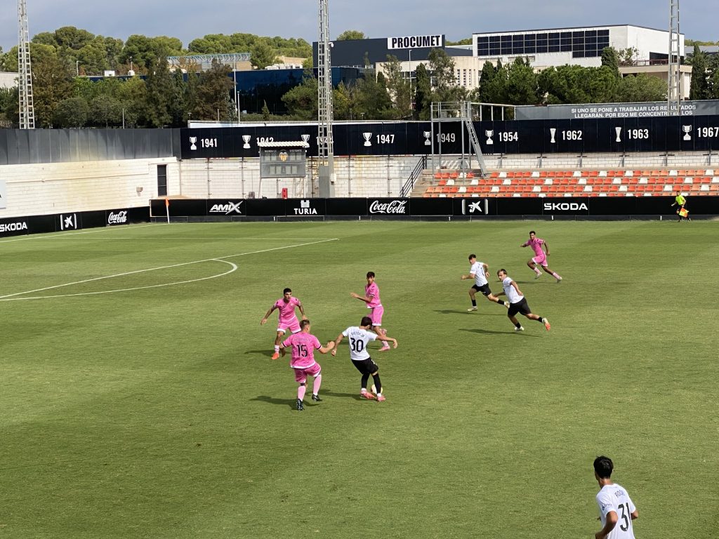 El filial valencianista saltó al césped con una actitud totalmente distinta a la de jornadas anteriores en el Puchades. Desde el primer instante quiso mandar, mostrando intensidad, determinación y una idea clara de juego. Pronto avisó Mario Domínguez con un disparo desviado por un defensa que obligó al portero visitante a lucirse abajo. El conjunto de Miguel Ángel Angulo dominaba, pero el Castellón ‘B’ golpeó primero al transformar un penalti cometido por Pere Joan tras una rápida contra. Lejos de venirse abajo, el ‘Mestalleta’ reaccionó bien y encontró el empate con un tanto de Víctor Jr, que cazó un balón suelto en el área para devolver la igualdad. Ese gol dio confianza y permitió al VCF Mestalla hacerse con el control del partido, aunque sin generar demasiado peligro. Sin embargo, cuando parecía estar todo calmado, un error en la zaga valencianista volvió a costarle caro y Nico Font aprovechó un centro raso al segundo palo para adelantar otra vez al filial ‘orellut’. Antes del descanso, Pere Joan sostuvo al segundo equipo ‘che’ con una gran parada que evitó el tercero.