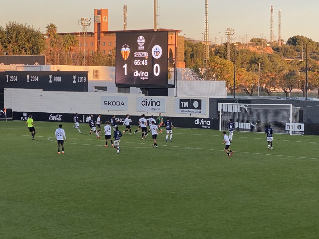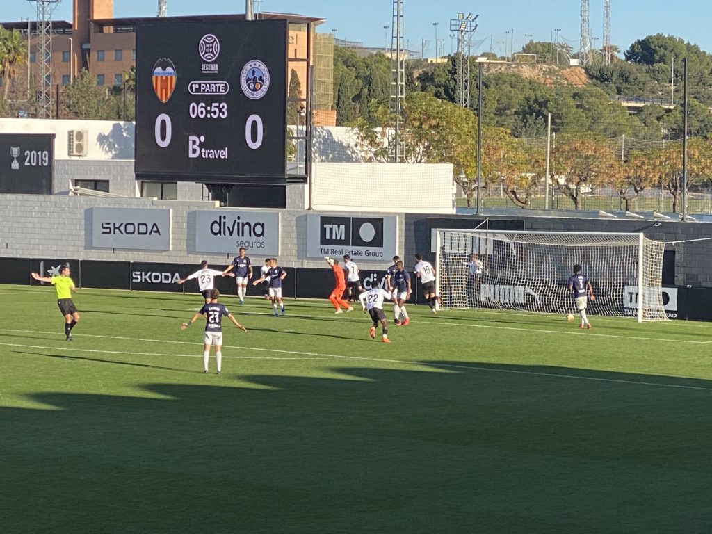 El partido arrancó con un VCF Mestalla con ritmo, chispa e intención de mandar e ir a por la victoria desde el pitido inicial. Prueba de ello es que los de Miguel Ángel Angulo tuvieron la primera clarísima nada más arrancar en una jugada rápida en la que David Otorbi dudó en los metros finales y no supo definir. La respuesta del Atlètic Lleida fue inmediata con un disparo ajustado de Boris Garrós que rozó el palo. Tras ese intercambio llegaría el tanto del filial valencianista en una acción de pura insistencia de Marcos Navarro en la que se libró de dos defensores y centró raso para que Marc Jurado abriera el marcador. El gol tranquilizó a un VCF Mestalla que se colocó bien, cedió la posesión y esperó imprecisiones para castigar al contragolpe a un Atlètic Lleida que se salvó en varias ocasiones, primero por la mala puntería de un ‘Mestalleta’ que rozó el gol en botas de Marc Jurado y Aimar Blázquez, pero sobre todo gracias a una parada antológica de un Pau Torres que voló para tapar con el cuerpo un remate a bocajarro justo antes del descanso. Los de Miguel Ángel Angulo marcharon a vestuarios habiendo ‘perdonado la vida’ a un endeble Atlètic Lleida.