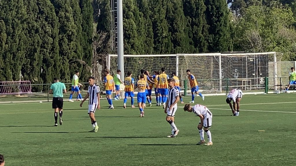 El paso por vestuarios no frenó a un VCF Mestalla que volvió a salir con intención de morder, generando peligro en transiciones rápidas y rozando el tercero en un contragolpe de manual finalizado por Rodrigo Gamón. El Castellón ‘B’ respondió con orgullo, obligando a Vicent Abril a intervenir con seguridad en un par de acciones, pero cada intento local se estrellaba contra un filial valencianista firme y sin fisuras que en un par de contras vertiginosas tuvo ocasiones claras en botas de Víctor Jr y David Otorbi para sentenciar el encuentro antes de la hora de juego. Tras ese intercambio inicial, el “Mestalleta” supo bajar las revoluciones, adueñarse del ritmo y jugar con la ansiedad de un filial ‘orellut’ que, obligado a dar un paso adelante para meterse en el partido, se fue partiendo. Y ahí, con espacios, llegó la sentencia: Leslie Okai apareció para ajustar un disparo a la cepa del poste y, poco después, aprovechó una indecisión defensiva para sortear al meta local y firmar el cuarto a placer. Aún pudo anotar el VCF Mestalla una ‘manita’, pero la vaselina de Aimar Blázquez no encontró portería.