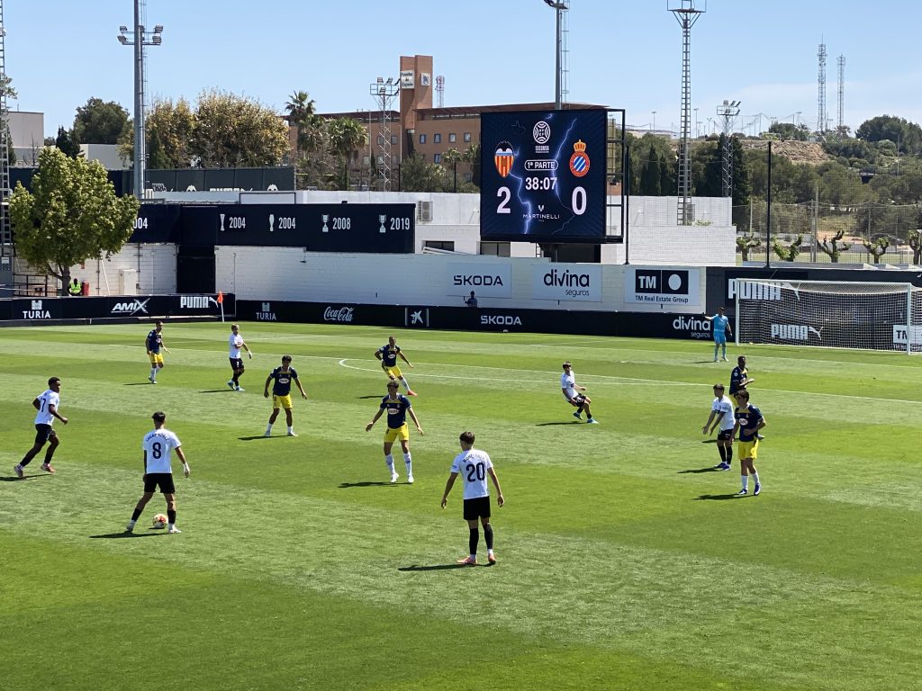 El paso por vestuarios agitó a un Espanyol ‘B’ que salió decidido a recortar distancias ante un VCF Mestalla adormilado que necesitó un par de ‘sustos’ para desperezarse. El más claro lo neutralizó un atento Vicent Abril sacando pecho en un chut a bocajarro que evitó que el partido se estrechara. Eso espoleó a un filial valencianista que respondió con una acción individual de Mario Domínguez que no encontró portería, en un tramo de ida y vuelta en el que el filial ‘perico’ se asomó con más frecuencia, aunque sin precisión, al área de los de Óscar Sánchez. El “Mestalleta” replicó con disparos lejanos que no inquietaron y, sobre todo, en una falta directa de Víctor Jr que se estrelló en la madera. En el tramo final, el Espanyol ‘B’ intensificó su empuje, avisó mandando un disparo al travesaño y cercó con peligro la meta de un seguro Vicent Abril al que lograron batir en dos ocasiones… con acciones antirreglamentarias. Y cuando parecía ya todo visto para sentencia y se esperaba el pitido final, sorprendió Leslie Okai con un zapatazo lejano que ponía el broche a otra serio encuentro de los de Óscar Sánchez.